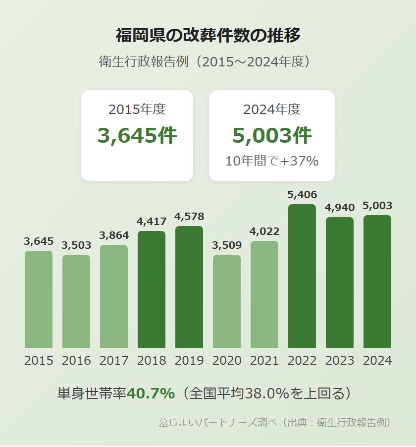 A衛生行政報告例によると、福岡県の改葬件数は2015年度の3,645件から2024年度には5,003件へと、37%増加しています。単身世帯率が40.7%と全国平均を上回っていることが背景にあると考えられます。