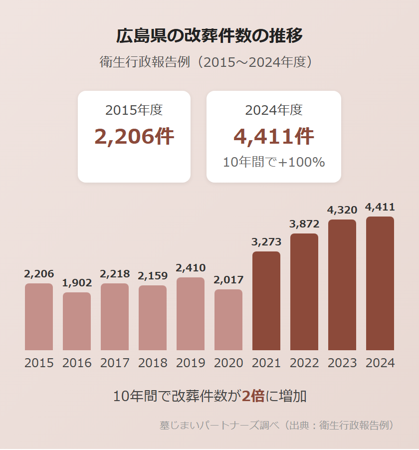 衛生行政報告例によると、広島県の改葬件数は2015年度の2,206件から2024年度には4,411件へと、約10年間で100%増加しています。