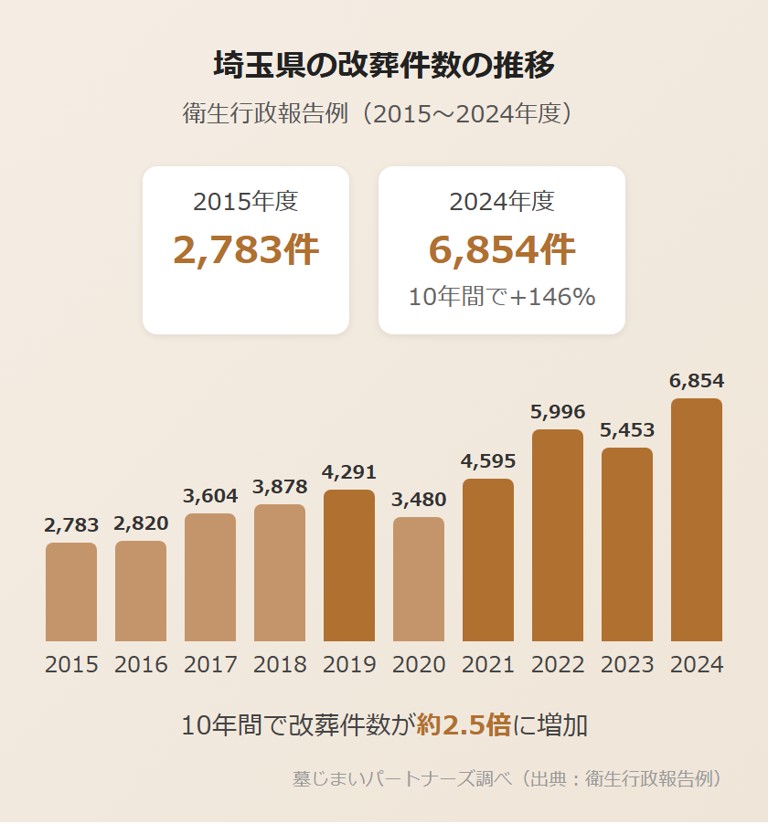 衛生行政報告例によると、埼玉県の改葬件数は2015年度の2,783件から2024年度には6,854件へと、約10年間で146%増加しています。