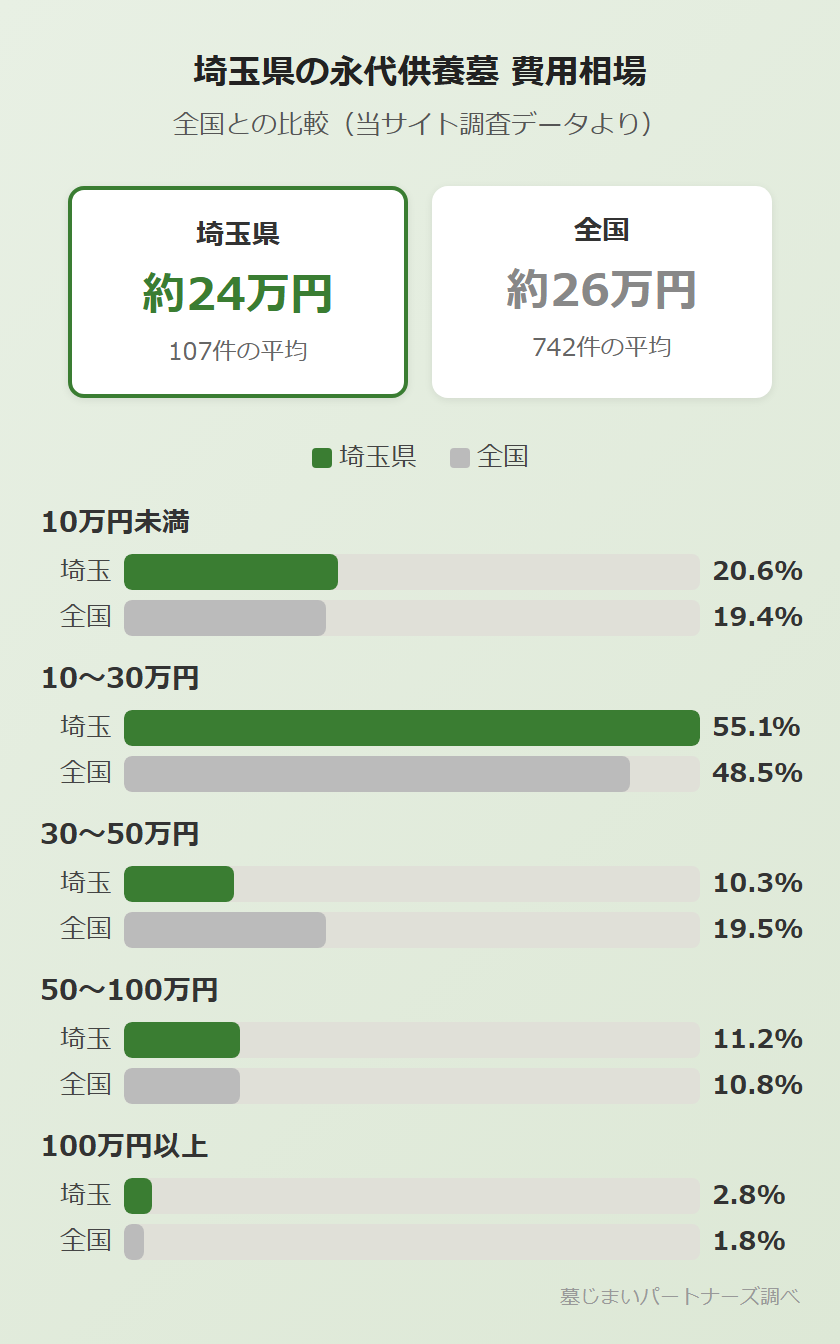 A当サイトの調査データでは、埼玉県内の永代供養墓は3万円台から利用できる施設があります。ただし、最安値の施設は合祀型で、遺骨を個別に安置するタイプではありません。個別安置型の場合は10万円台からが目安です。10〜30万円の価格帯が全体の55%を占めており、手頃な施設を見つけやすいエリアです。