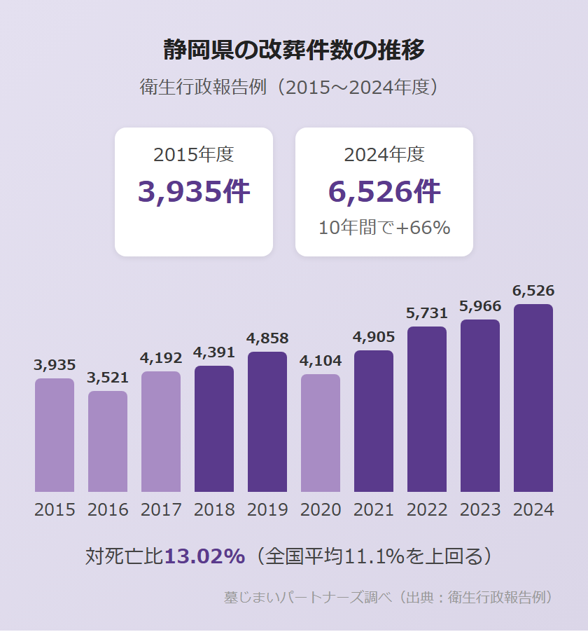 衛生行政報告例によると、静岡県の改葬件数は2015年度の3,935件から2024年度には6,526件へと、約10年間で66%増加しています。