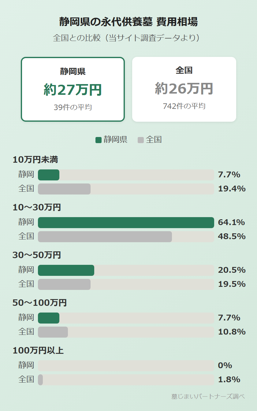 当サイトの調査データでは、静岡県の永代供養墓の平均費用は約27万円で、全国平均の約26万円とほぼ同じ水準です。中央値は20万円。