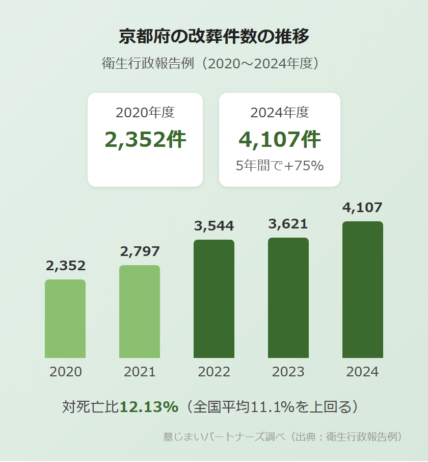 衛生行政報告例によると、京都府の改葬件数は2020年度の2,352件から2024年度には4,107件へと、5年間で75%増加しています。