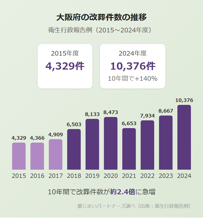 衛生行政報告例によると、大阪府の改葬件数は2015年度の4,329件から2024年度には10,376件へと、約10年間で140%増加しています。