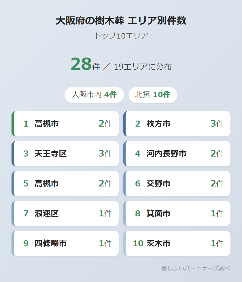 大阪府内の樹木葬28件は、19のエリアに広がっています。
