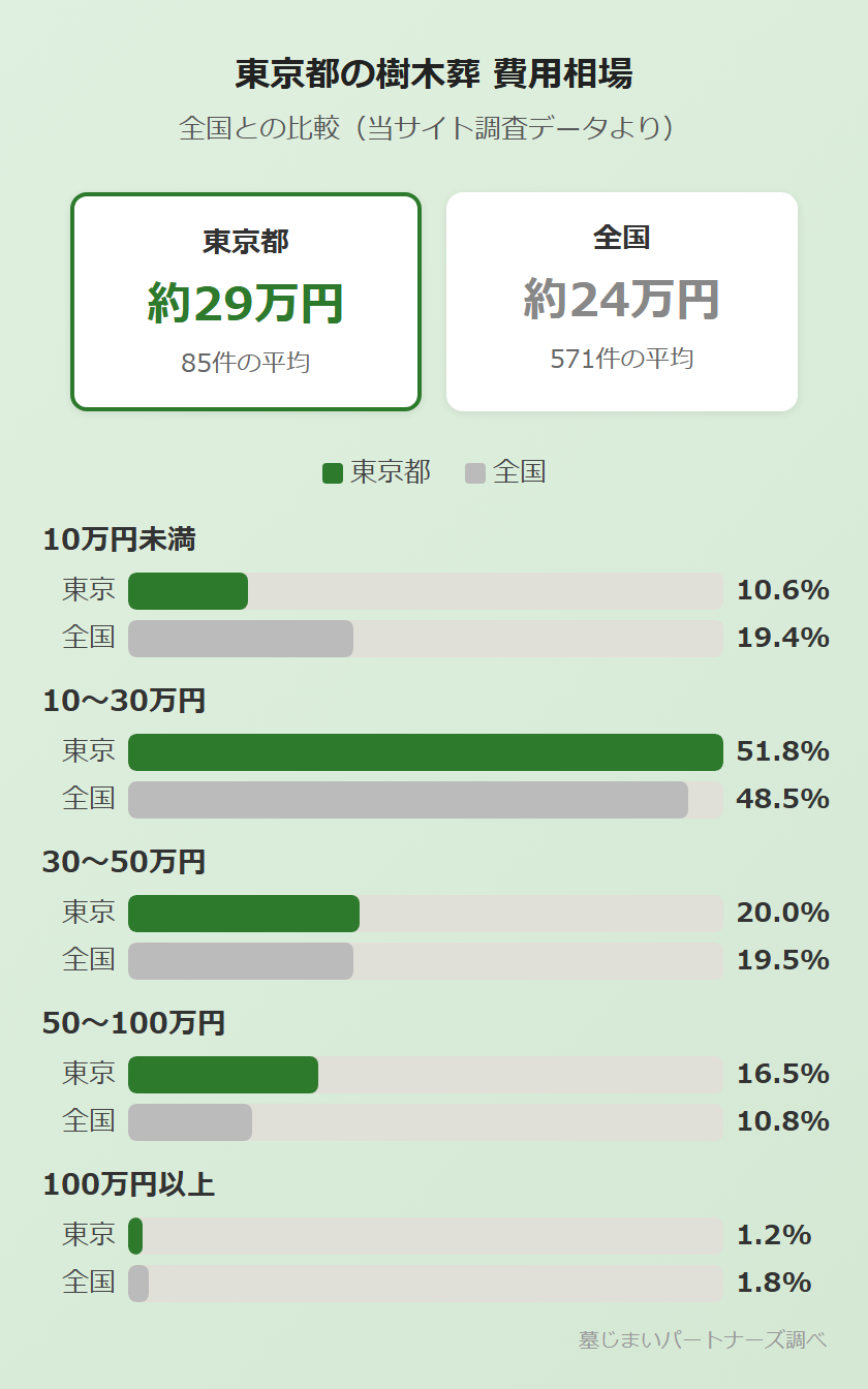 当サイトの調査データでは、東京都の樹木葬の平均費用は約29万円で、全国平均の約24万円を上回る傾向にあります。中央値は20万円。