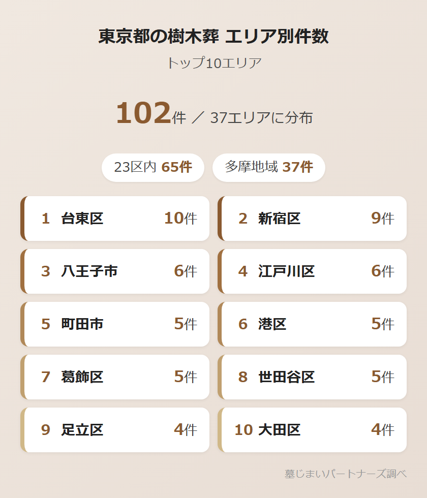 東京都内の樹木葬102件は、37のエリアに広がっています。