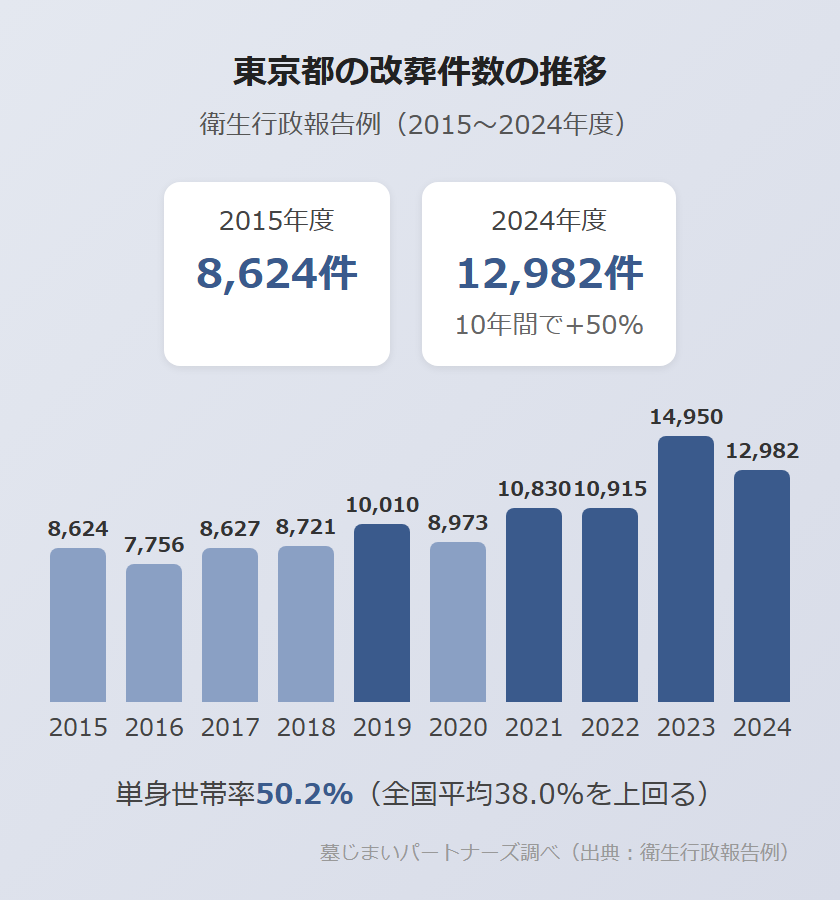 衛生行政報告例によると、東京都の改葬件数は2015年度の8,624件から2024年度には12,982件へと、約10年間で50%増加しています。
