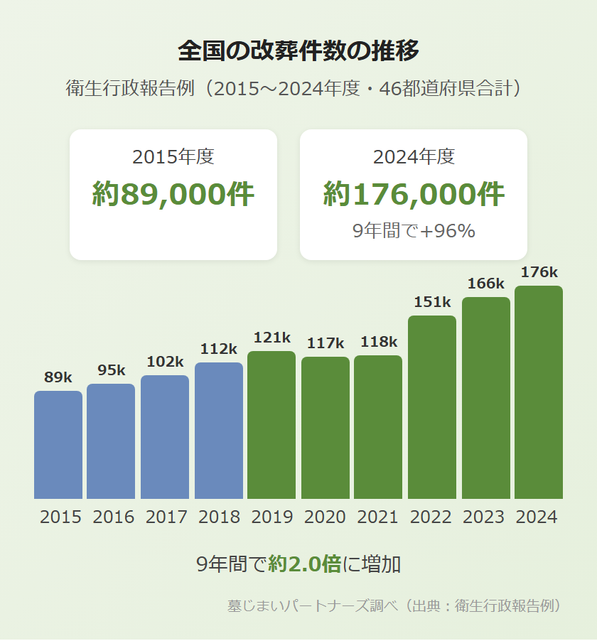衛生行政報告例によると、全国の改葬件数は2015年度の約89,700件から2024年度には約172,000件へと、10年間で92%増加しています。