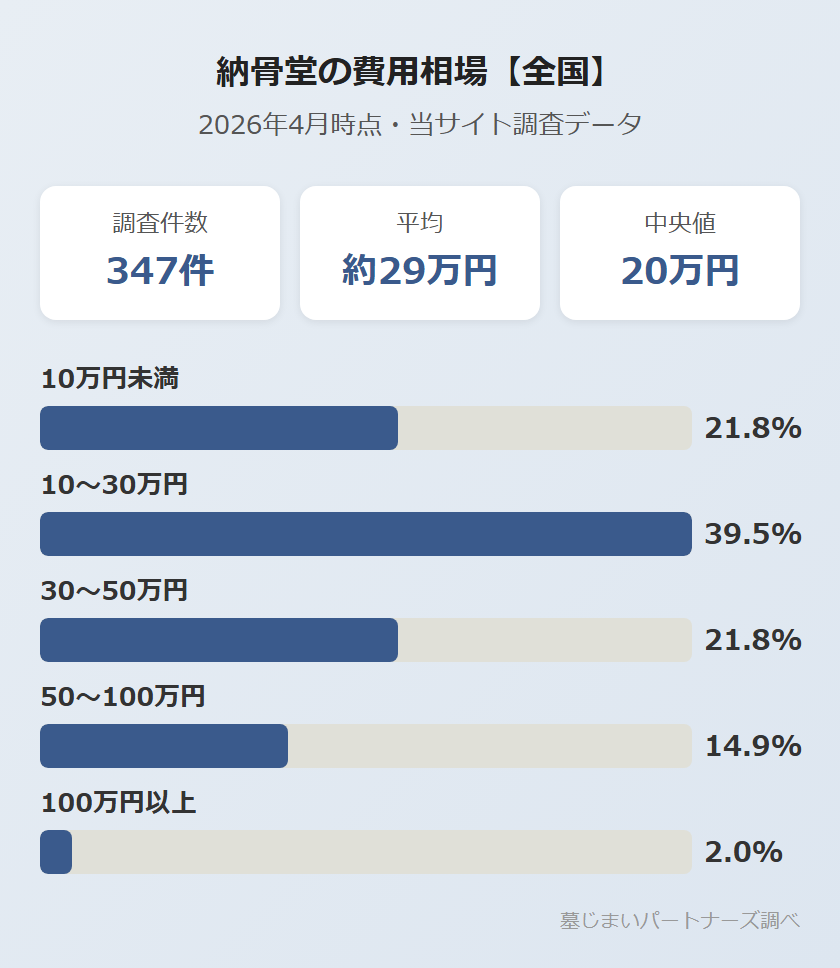 A2026年4月時点の当サイト調査データでは、全国の納骨堂の平均費用は約29万円、中央値は20万円です。ロッカー型なら1〜15万円、仏壇型なら20〜80万円、自動搬送型なら50〜150万円が目安です。