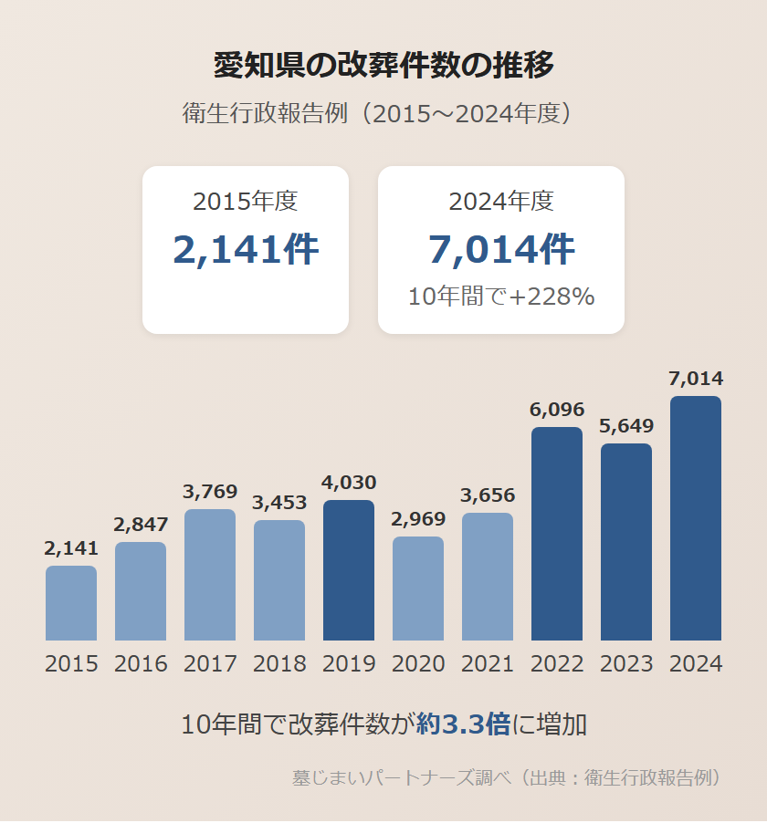衛生行政報告例によると、愛知県の改葬件数は2015年度の2,141件から2024年度には7,014件へと、約10年間で228%増加しています。