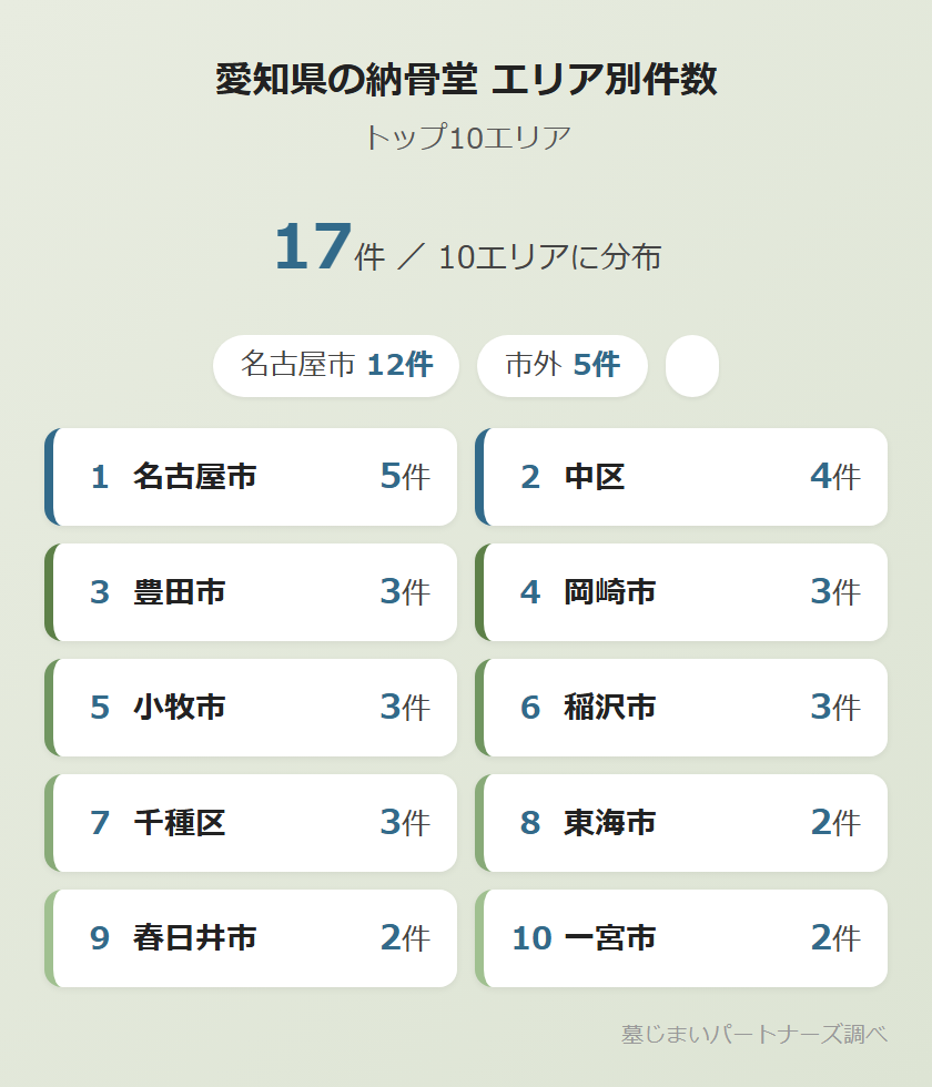 A当サイトの調査データでは、名古屋市内に12件の納骨堂があります。中区(4件)・名東区(2件)を中心に市内各地に分布しています。