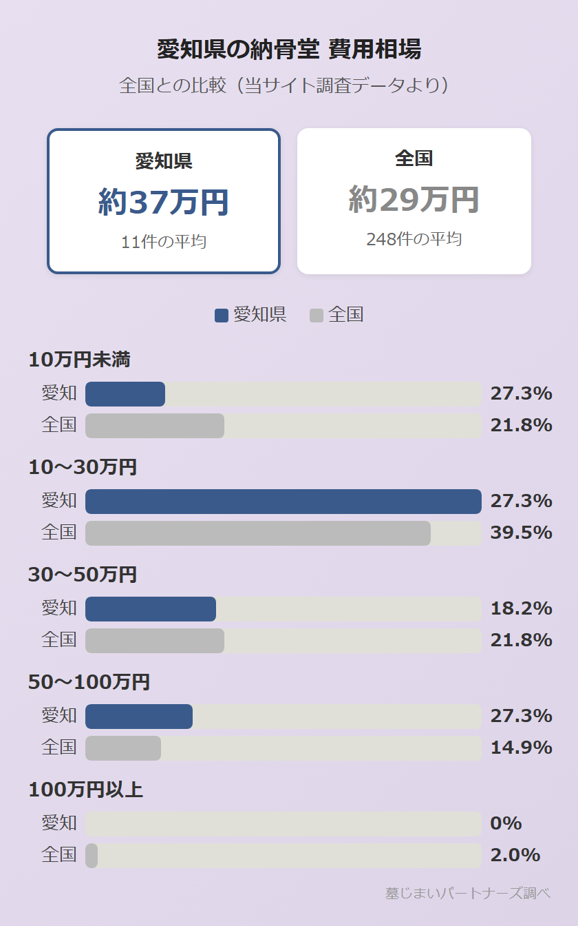 当サイトの調査データでは、愛知県の納骨堂の平均費用は約37万円で、全国平均の約29万円を上回る傾向にあります。中央値は25万円。