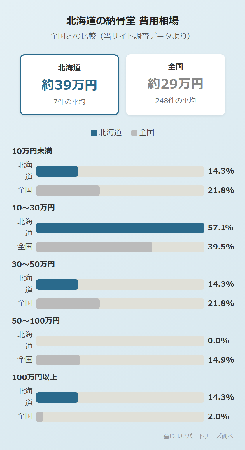北海道の特徴は、10〜30万円の施設が57.1%と過半数を占めていること。全国平均(39.5%)を大きく上回り、手頃な価格帯のロッカー型・仏壇型が充実しています。ただし、実際の費用は施設ごとに異なります。