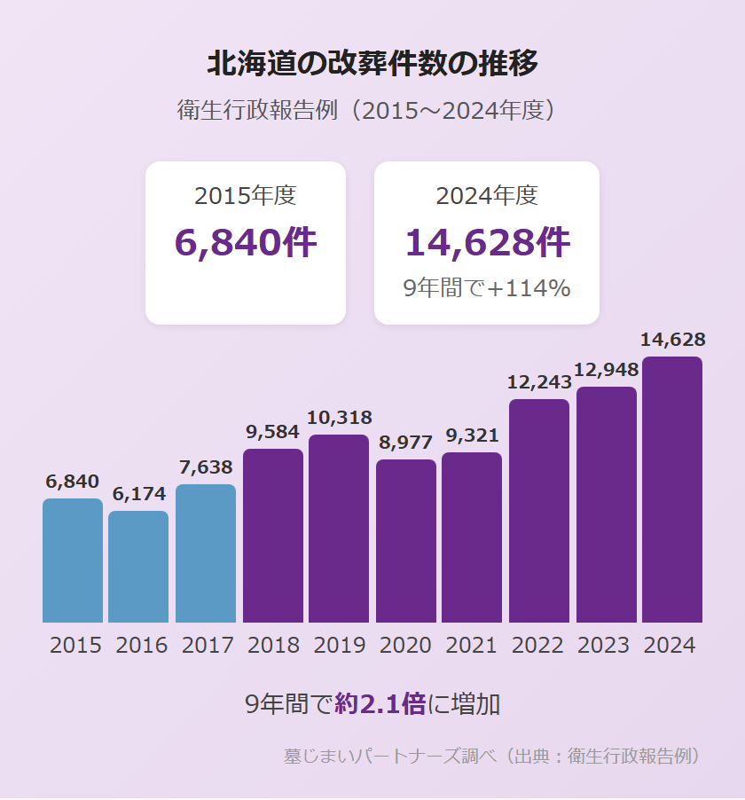 衛生行政報告例によると、北海道の改葬件数は2015年度の6,840件から2024年度には14,628件へと、約10年間で114%増加しています。